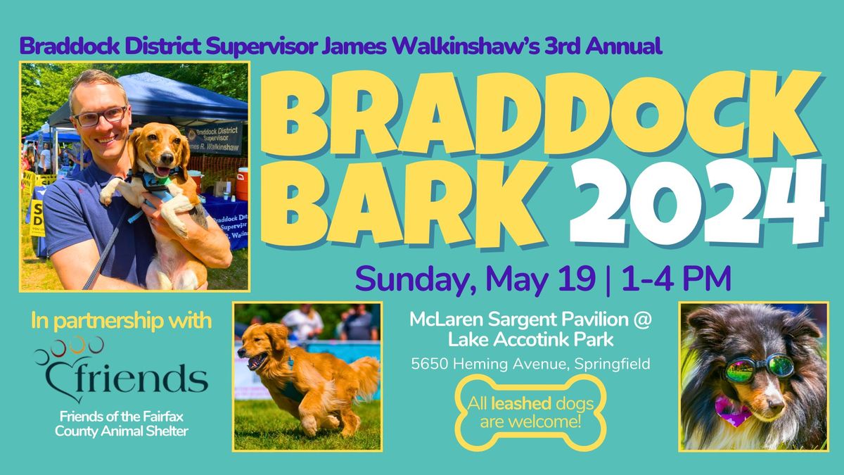 Make plans to join us Braddock Bark 2024, to be held at Lake Accotink Park on Sunday, May 19, 2024.