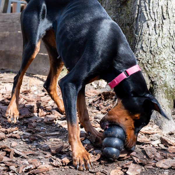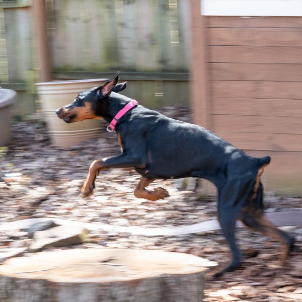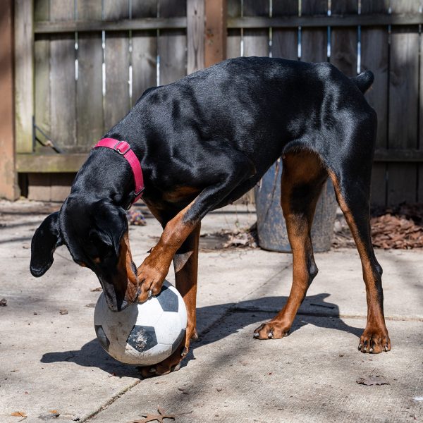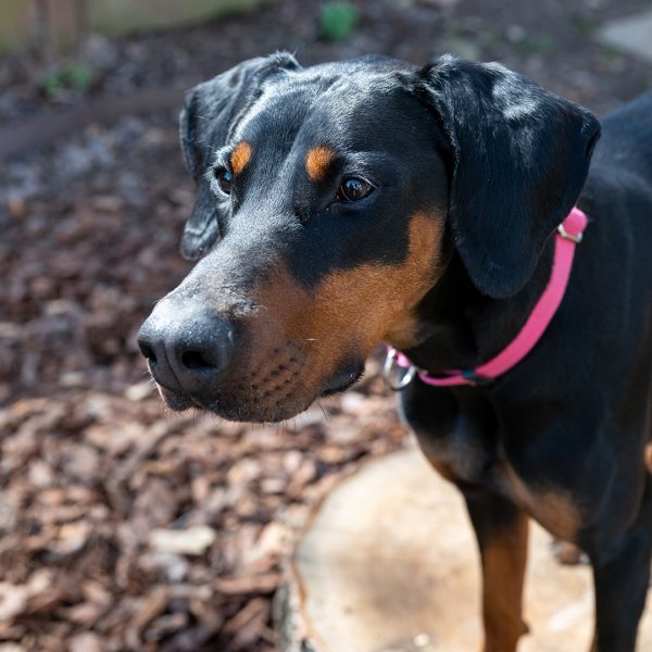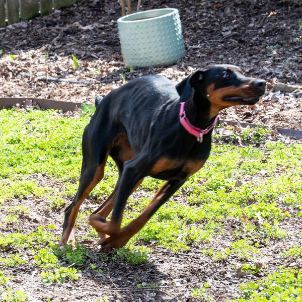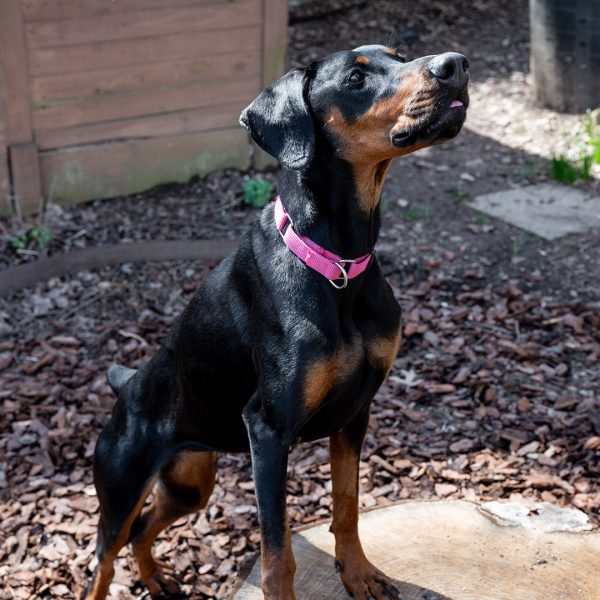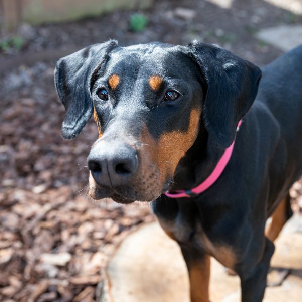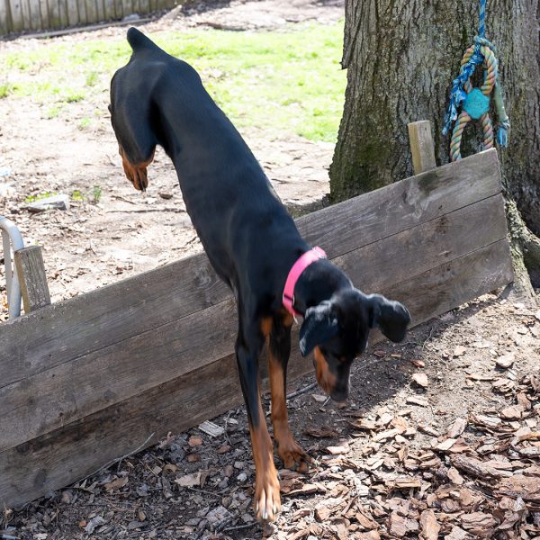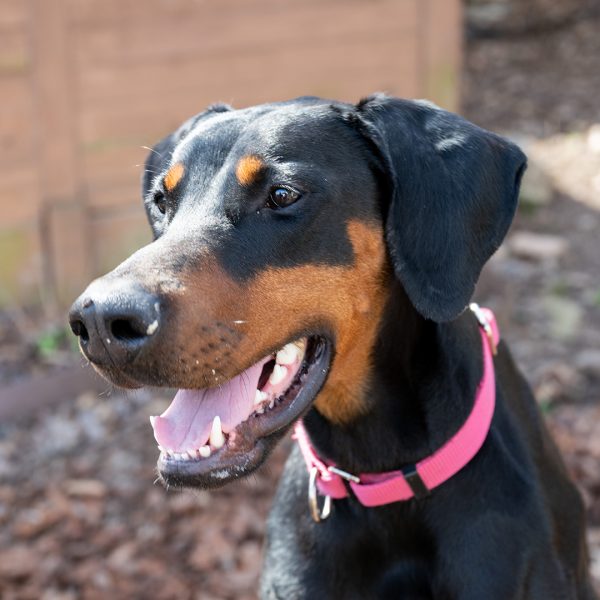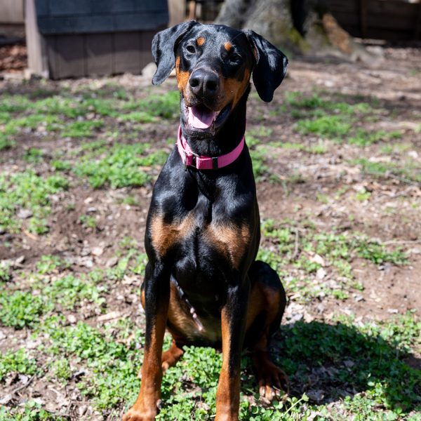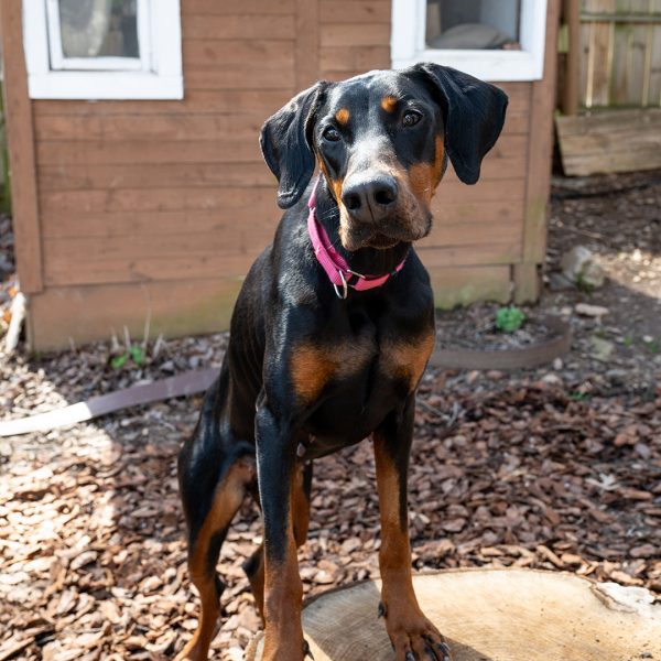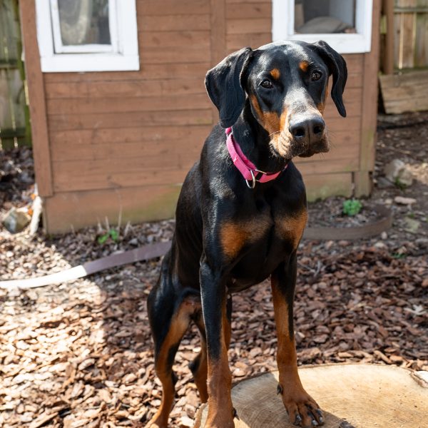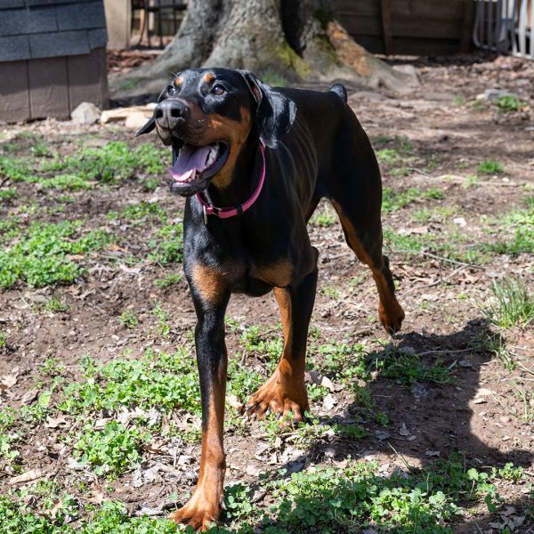 She’s a bit nervous at the vet and around new things, showing her nervousness with barking. She responds well and is able to reset and settle in a short amount of time. Alara will require an adopter with prior Doberman or working dog experience, and someone providing structure in her life and exposing her to things little by little. She will also need someone who has experience with younger dogs, providing appropriate chews and toys, and understanding puppyish behavior.