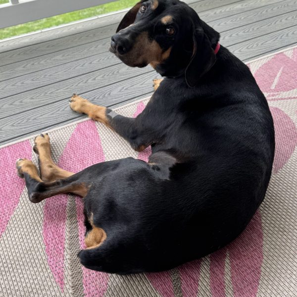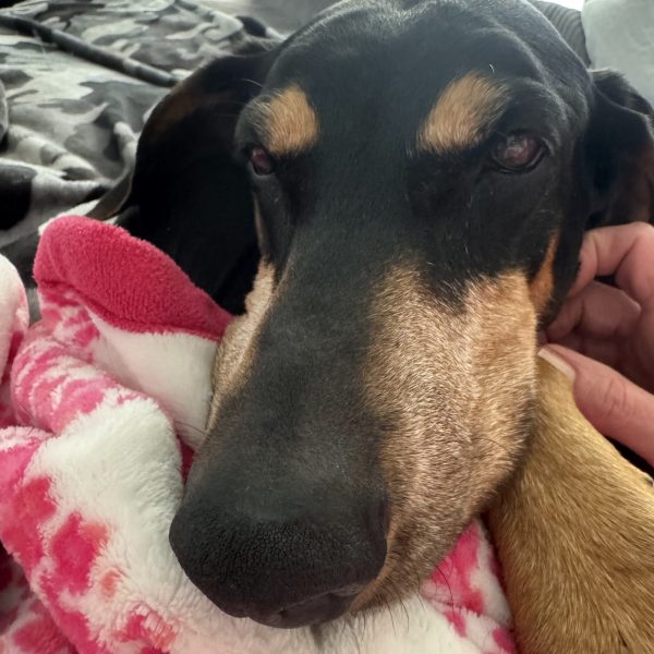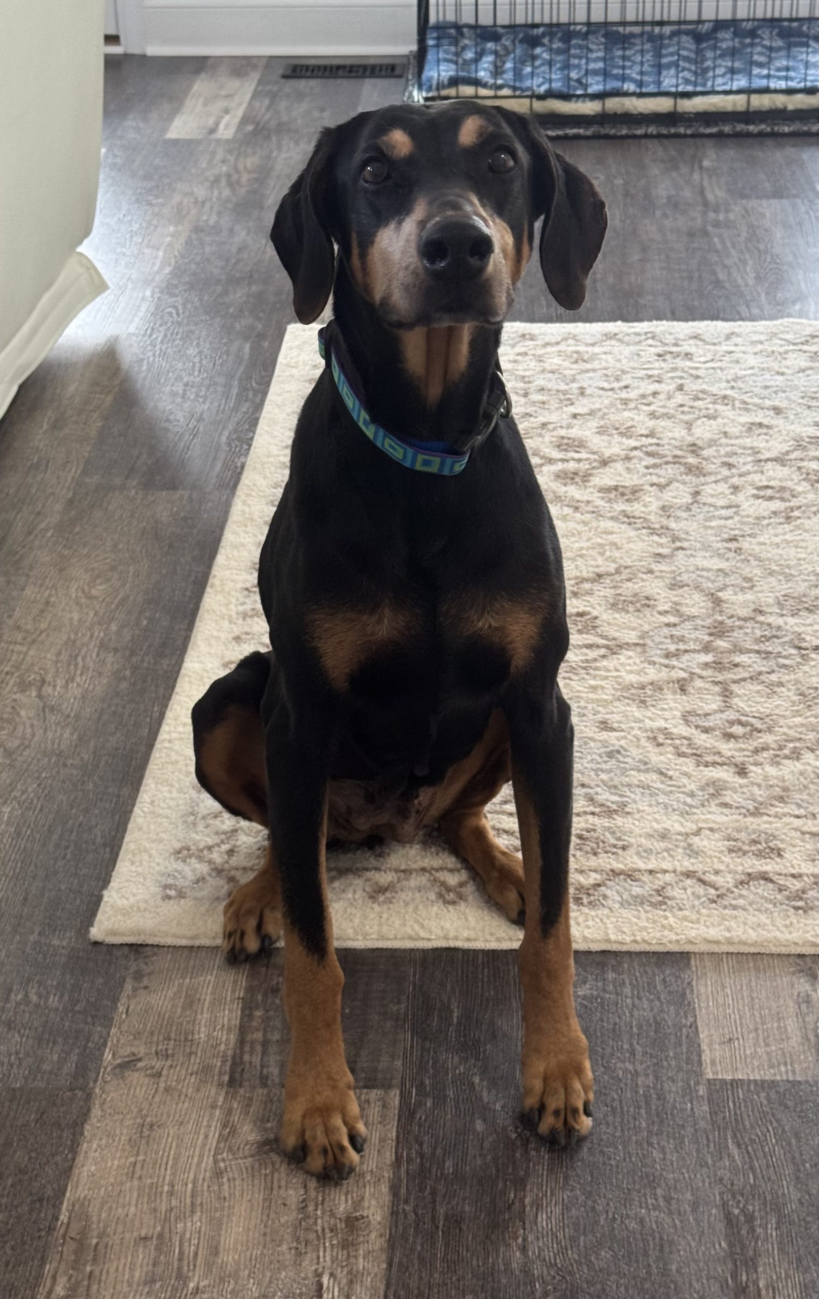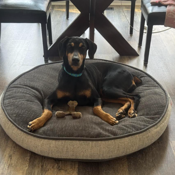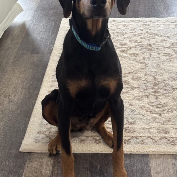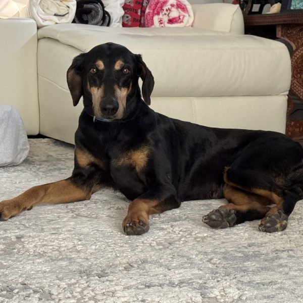Meet Zena, a happy and sweet, 6-and-a-half-year-old, black & tan female Doberman. She is just a little girl at 60 pounds. She has naturally floppy ears and a docked tail. She is a smart and loving girl who quickly acclimatized to her foster home. She loves to follow you around and wait for her pets like the true velcro dog that she is. Zena is looking for a couch potato lifestyle. She likes to curl up beside you when watching TV so she can be near you. At night she sleeps on a dog bed on the floor next to to the bed.