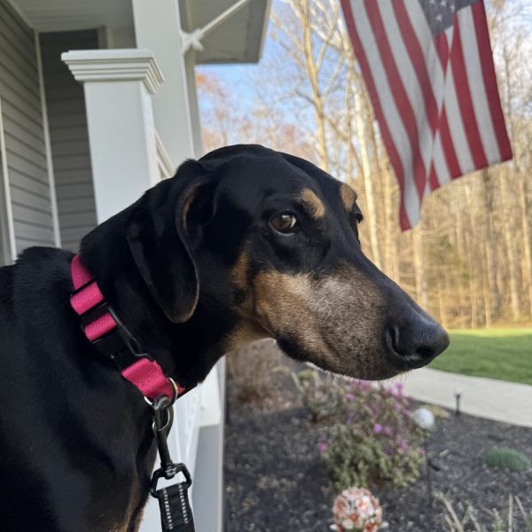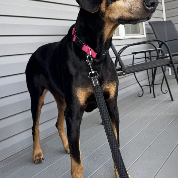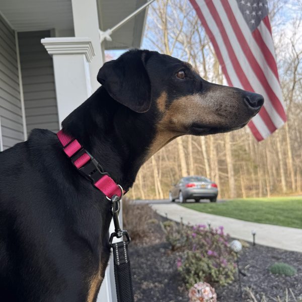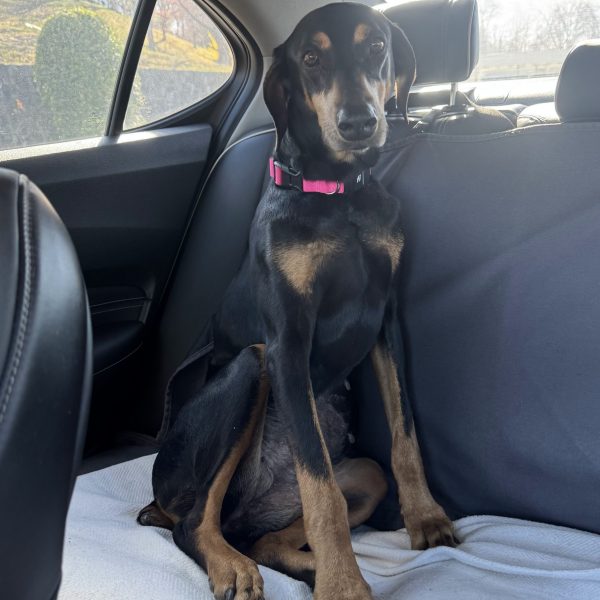 Zena has Wobbler’s Disease which you can see with her notable gait when walking, which means she will need a low impact lifestyle. Zena has plenty of years left in her life, but will be impacted by this diagnosis. That doesn’t mean she can’t live a full life. Zena LOVES to use her nose outside. She will track all through the yard smelling where the squirrels and other small animals have been. She likes taking short walks and walks well on the leash. Her diagnosis though does mean that she can’t play rough with other dogs, so if you have a dog, an older or less rough-playing dog would be her best companion. A low impact lifestyle means – minimized jumping, minimized stairs, shorter walks, and using a harness rather than a neck collar.