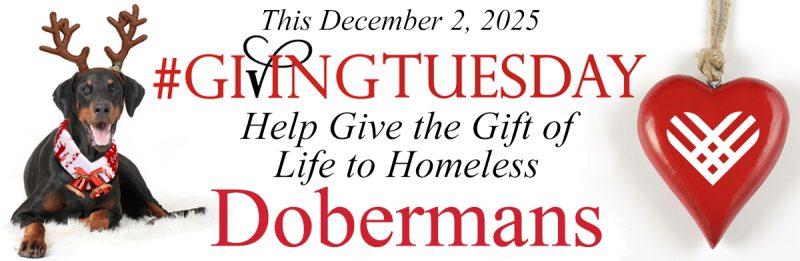 - Donate – As a special thank you for your support on Giving Tuesday, if you donate $200.00 or more, we will send you our beautiful new set of 10 Doberman note cards, featuring 5 different photos.